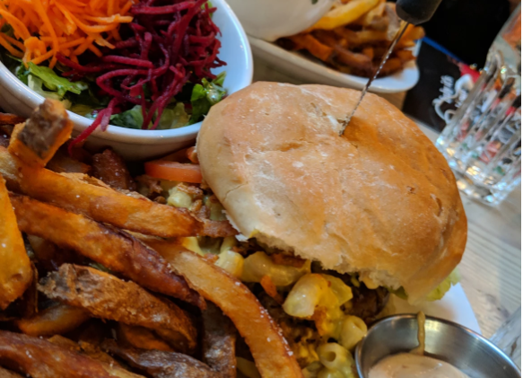 こちらが私が注文したお気に入りのマカロニチーズ入りのハンバーガー。 ボリューミーでフライとサラダもついてきます。