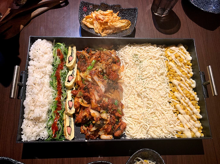 白ご飯、ピリ辛ネギ、ソーセージと海苔を挟んだ卵焼き、お野菜たっぷりトッポギ(おもち)入りのタッカルビ、これでもかと盛られたチーズ、マヨコーン。