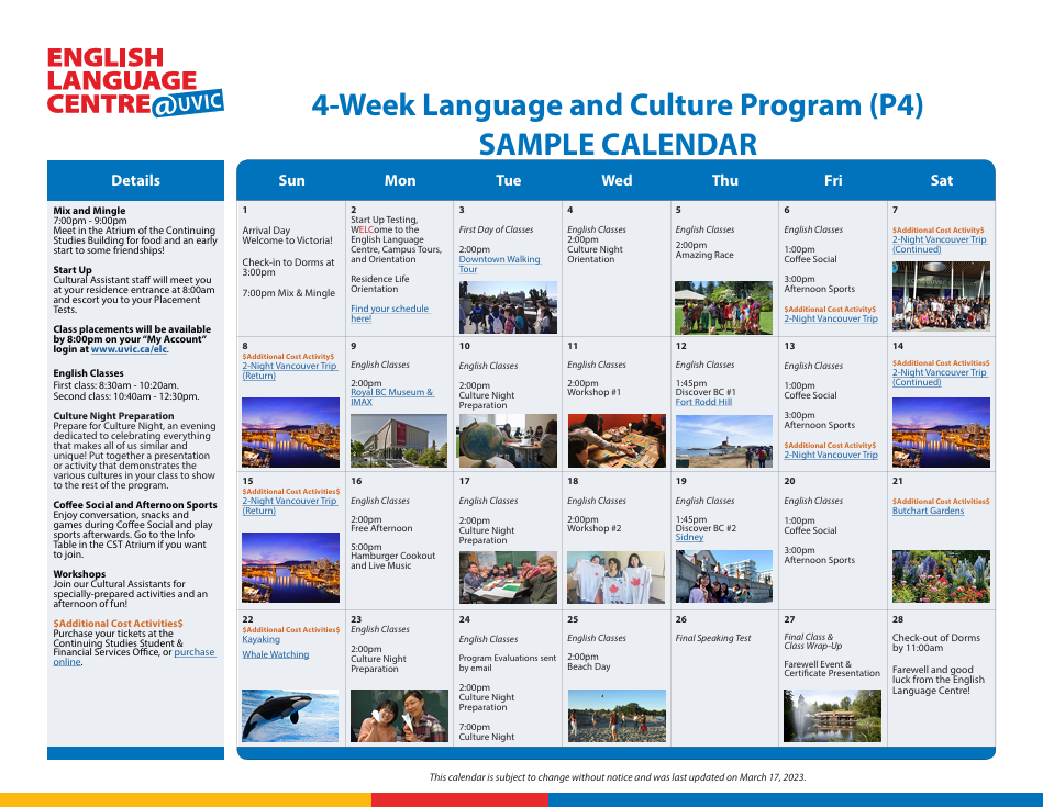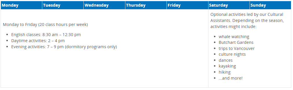 - アクティビティの例: クジラウォッチング、ブッチャートガーデン、バンクーバーへの遠足、文化交流ナイト、ダンス、カヤック、ハイキングなど。